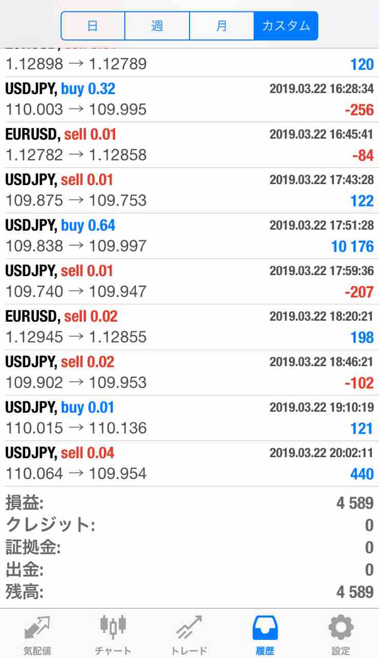 自動売買ソフト「dawn」 3月22日 結果報告 結果報告2019.03.23こんにちは。3月22日(金) dawn 口座 A 1万スタート ¥+98(myfxbook掲載中)口座 B 3万スタート ¥+222(myfxbook掲載中)口座 C 10万スタート ¥+4589(myfxbook掲載中合計利益 ¥+4909dawnは調子いいのですが、私の体調がかなりやばいです(>_<)ここ2日立ち上がる事もしんどいです。早く元気になるようゆっくりします。では、また。。