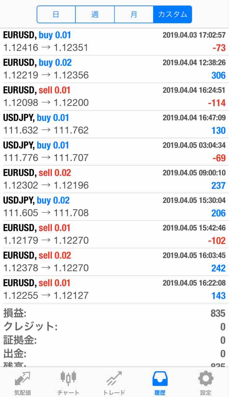 自動売買ソフト「dawn」 4月5日 結果報告 結果報告2019.04.062019.04.07おはようございます。4月5日(金) dawn口座 A 1万スタート ¥+0(myfxbook掲載中) 口座 B 3万スタート ¥+328(myfxbook掲載中) 口座 C 10万スタート ¥+835(myfxbook掲載中)合計利益 ¥+1163昨晩は、平成最期のジブリ雇用統計の日でした。と言っても、30pipsも変動がなかったですね。実は、今のC口座の設定をナンピン幅20.0で先週から試しています。今週の実績はナンピン幅20.0 利確140で設定していました。で、どうだったか?含み損は多く持つことはありませんでした。ただ、利確がやはり遅いですね。来週から18.0位に落としてまたやってみます。多分、あまり利益が上がってないなぁと思われていた方もいると思いますが、こういう事だったんです。(^^;では、また。。