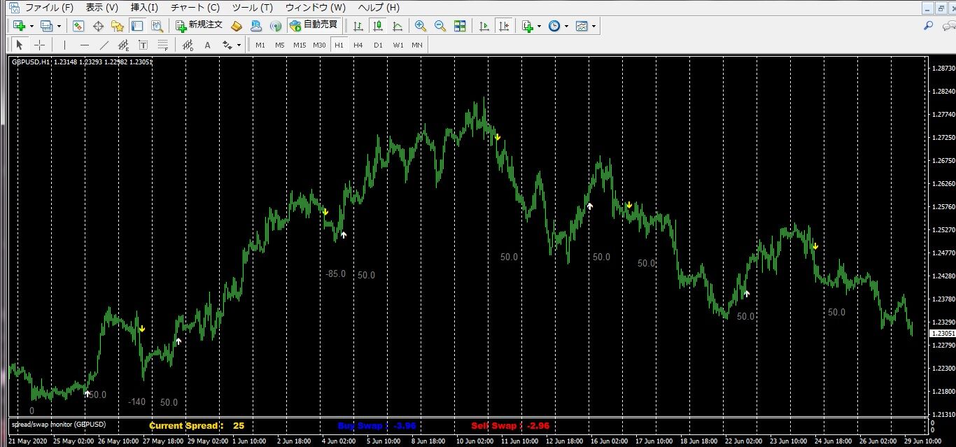 利益を50pipsに設定、損切りを単純に相場が転換したとして反対の矢印が出たときに損切りそしてそのままドテンするとします。