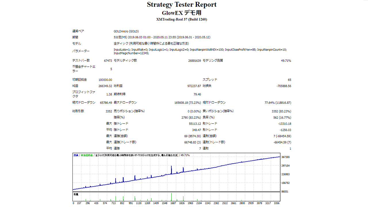 あくまでもバックデータの結果ですが、現在もデモ口座を公開していますが(XMdemo3 ID 23455851 パスワードGlowex)現在見ていただいても100,000円が2か月で145,000円まで増加していますので上記のデータもまんざらではないと思います。