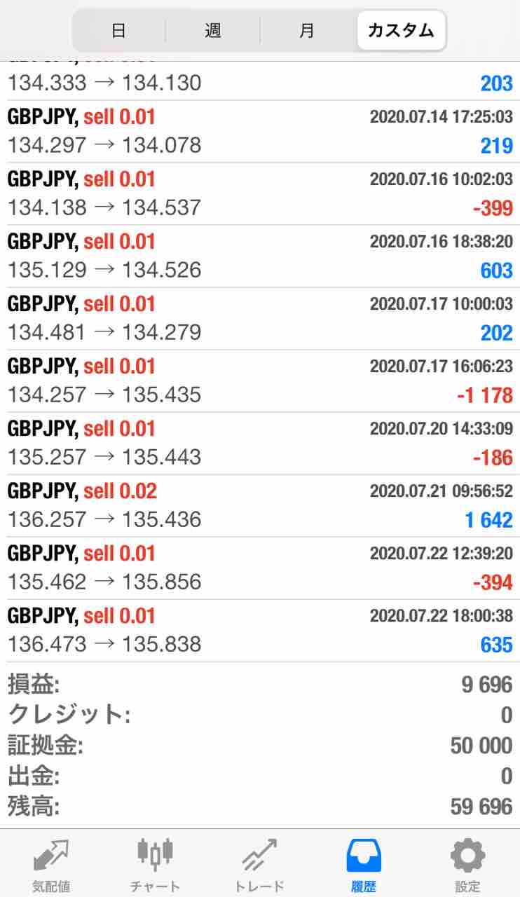このようにEXではどんな通貨も利用可能です。ちなみにポンド円も継続していますが6月2日から開始して現在まで9600円の利益が出ています。これも1か月半で20%増えています。それがそのポンド円です。50000円の資金で1000通貨